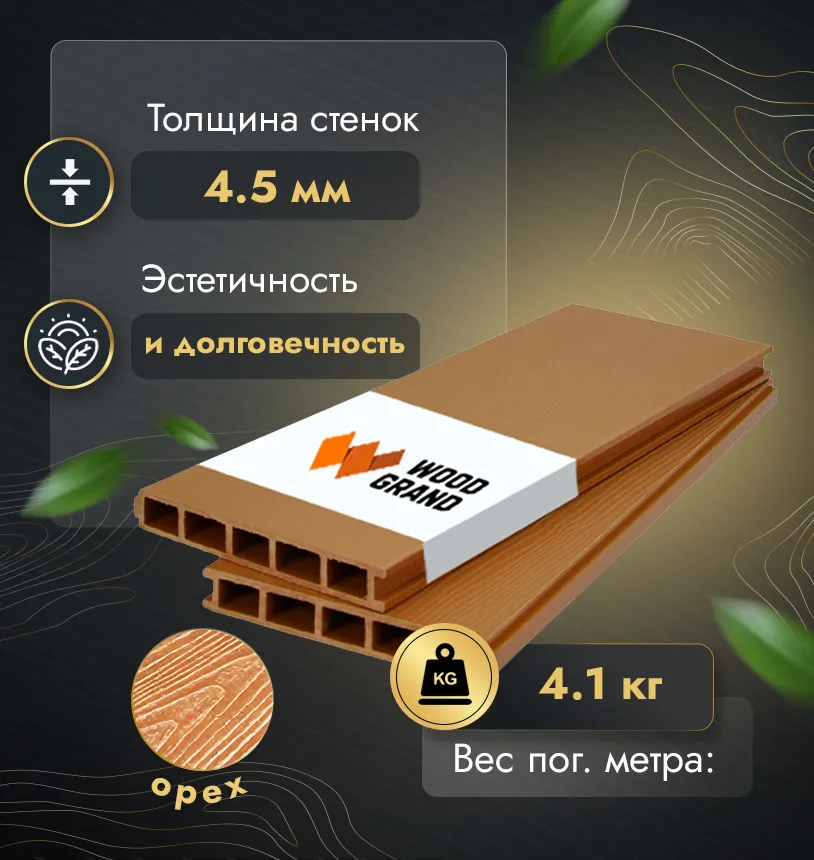 Наша террасная доска из МПК выдерживает до 3318 кг/м2, влагостойкая, не требует ухода.